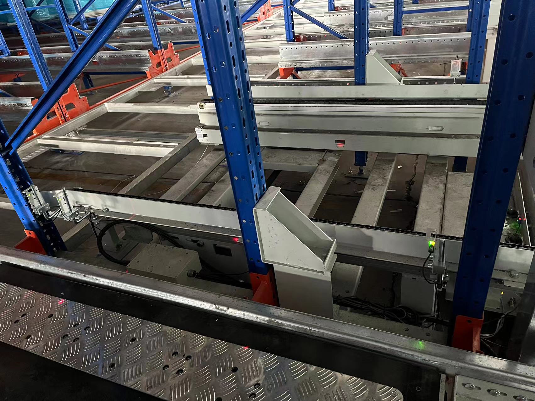 四向車根據任務要求,協同往複式提升機,通過行駛軌道在貨架不同層、不同貨道內完成作業任務,在倉庫監控(kòng)係(xì)統(tǒng)的控製和調度下,整個(gè)密集庫(kù)可以實(shí)現多層多車同時運作,各四向車在工作時可以(yǐ)向信息管理係統上傳位置(zhì)、速度、電量、有無貨、故障、工作情(qíng)況等信息;四向車具備整存整取、倒貨移動、托盤點數等作業功能,實現物料快速(sù)出庫和庫存管(guǎn)理;其內部設(shè)置有避障功能和故障報警提示功能,能夠起到安全(quán)保護作用,並(bìng)及時(shí)反饋故障(zhàng)信息。從硬件係統來看(kàn),四向車主(zhǔ)要由(yóu)車架、頂升(shēng)機(jī)構、驅動機構、車輪組、電源(yuán)、電氣控製等部件組